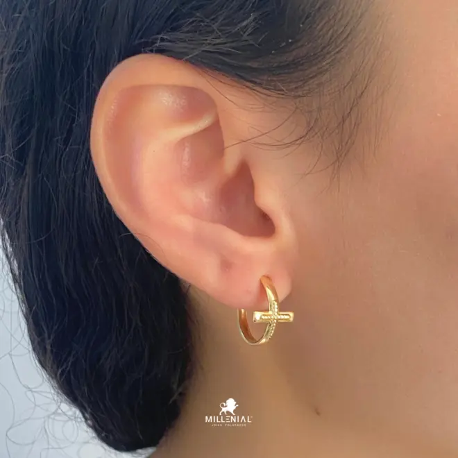 A peça é uma meia argola que abraça o lóbulo com conforto, e sua parte frontal é formada por uma cruz "deitada". Um detalhe especial é a sutil textura pontilhada sobre a cruz, que cria um efeito de brilho delicado e um contraste charmoso com o aro liso e polido.