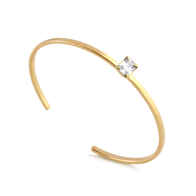 Com um design minimalista e moderno, este bracelete destaca-se pela simplicidade da sua estrutura e o brilho impactante da pedra solitária em formato quadrado.