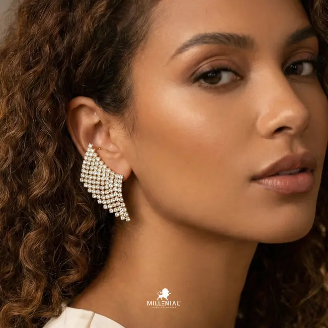 Brinco Ear Cuff Franja Com Pedras de Zircônia Folheado a Ouro 18k