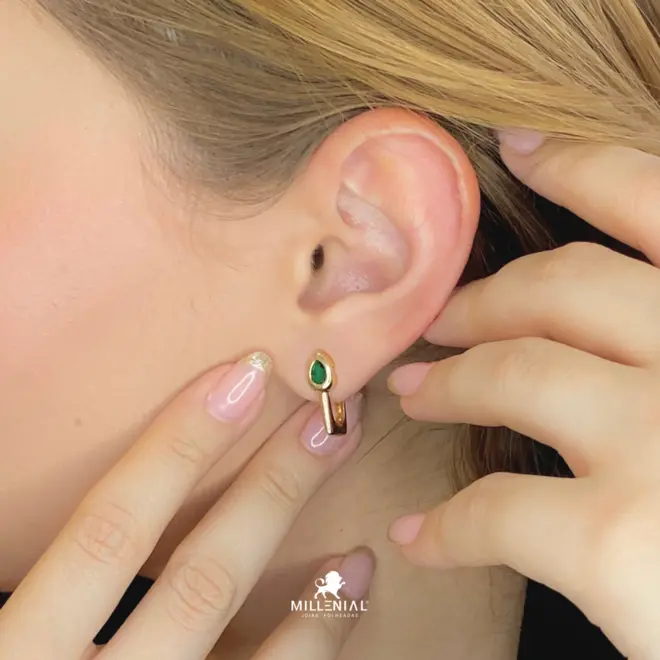 O design de gancho (ear hook) acomoda-se com segurança e modernidade na orelha, enquanto a pedra em formato de gota simboliza a lágrima que foi transmutada, representando a cura e a limpeza emocional. A cor verde vibrante da pedra é o coração desta peça: ela simboliza a esperança, o crescimento, a renovação da natureza e a vida nova que pulsa em você.