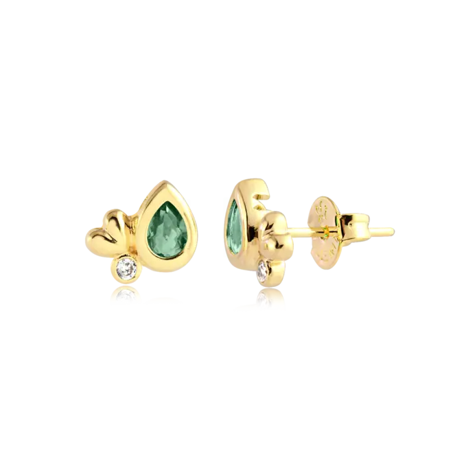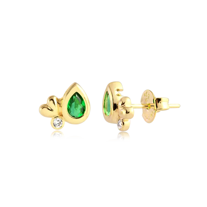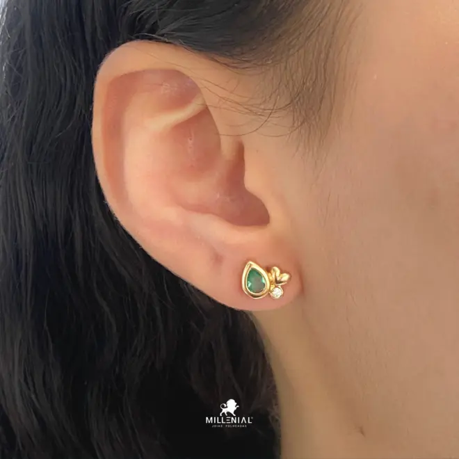 - A Gota de Zircônia: Uma pedra central em lapidação gota (pera) na cor verde esmeralda, que adiciona um ponto de cor vibrante.