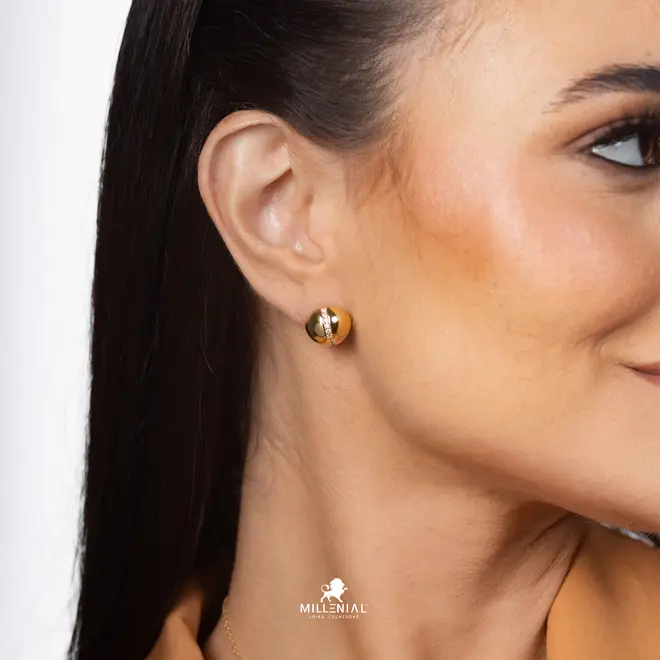 Brinco Meia Bola Fileira Zircônia Folheado a Ouro 18k