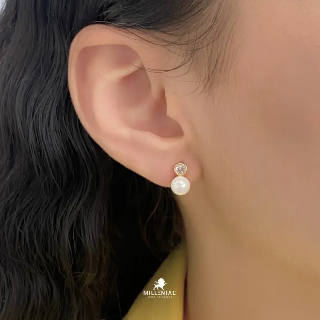 O Ponto de Luz Moderno: Coroando a pérola, um ponto de luz de zircônia é fixado em um engaste tipo chaton (bezel). Esse aro de metal liso ao redor da pedra confere um visual limpo, moderno e muito sofisticado.