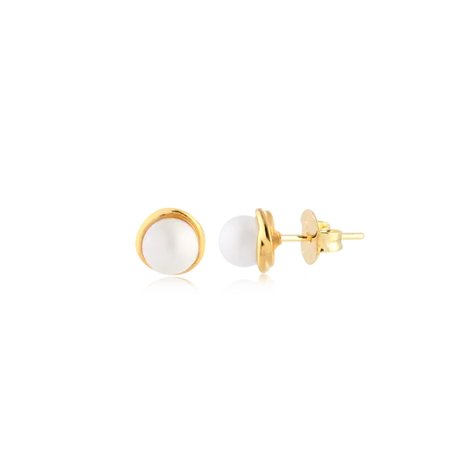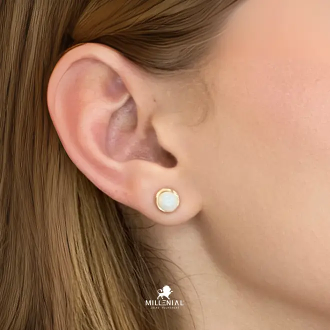 - Design: Brinco botão (stud) com círculo de madrepérola (ou material perolado)