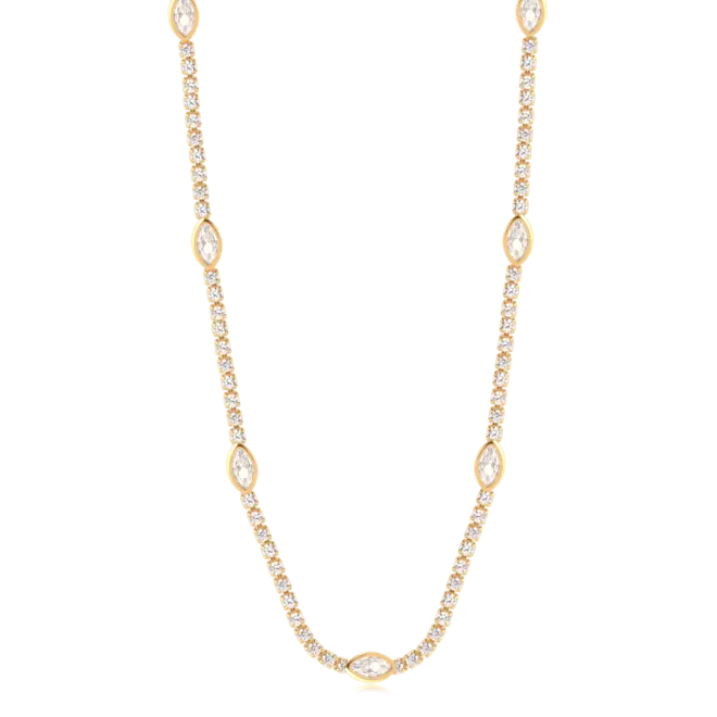 Este colar statement é a definição de glamour moderno. Sua estrutura é inteiramente cravejada por fileiras de Zircônias cúbicas cintilantes, no estilo Tennis Necklace, com o toque de requinte das gemas Navete (formato marquise) distribuídas ao longo da corrente, que criam um efeito de pontos de luz em cascata.