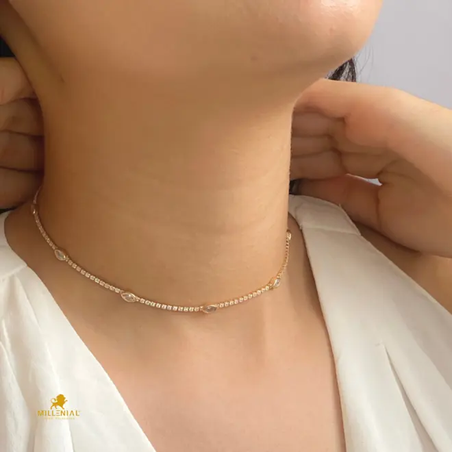 Lumine: Onde a sua luz encontra a joia perfeita. Adquira a Gargantilha Choker Cravejada Navete e prepare-se para brilhar intensamente.