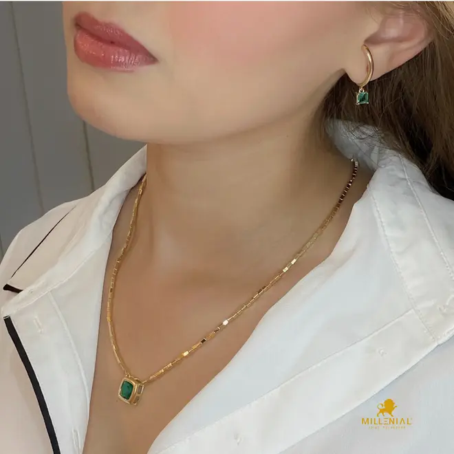 - Design: Gargantilha com pingente fixo de pedra quadrada (ponto de luz)