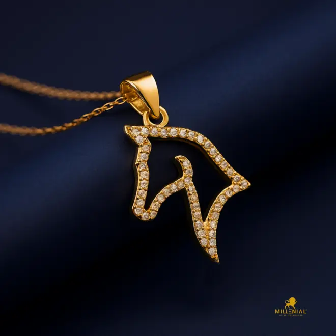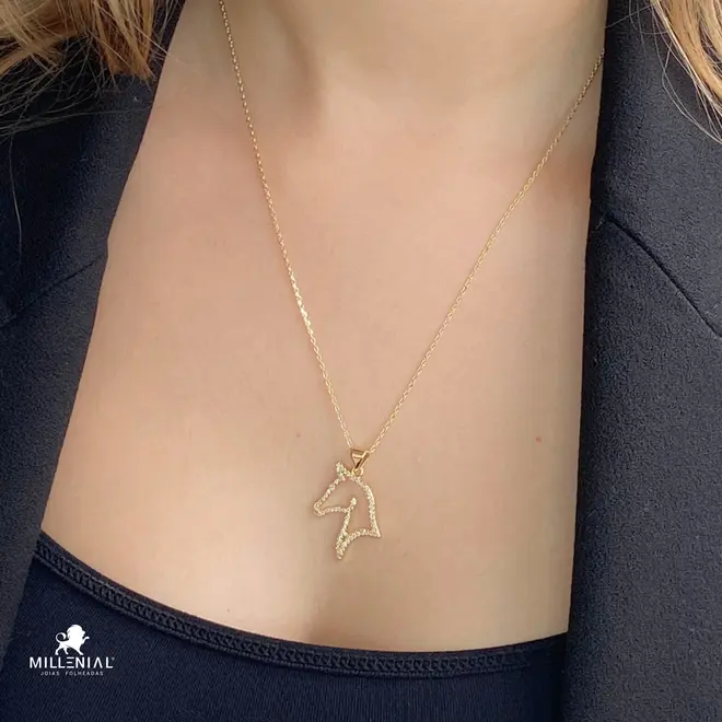 - Design: Pingente com figura de cavalo e estrela cravejada