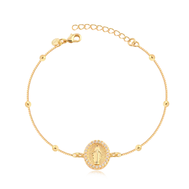 O design delicado, com sua corrente de bolinhas, representa a continuidade da vida e a sucessão de pequenos milagres diários. No centro, a medalha de Nossa Senhora das Graças, finamente trabalhada e iluminada por zircônias, é um poderoso símbolo de amparo e intercessão. Ela representa a fé que nos reconstrói e a certeza de que nunca estamos sozinhas em nossa jornada de superação.