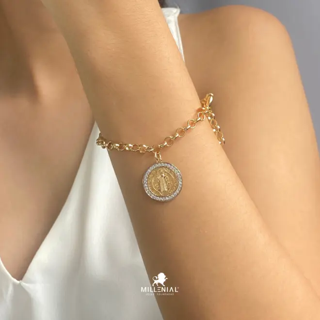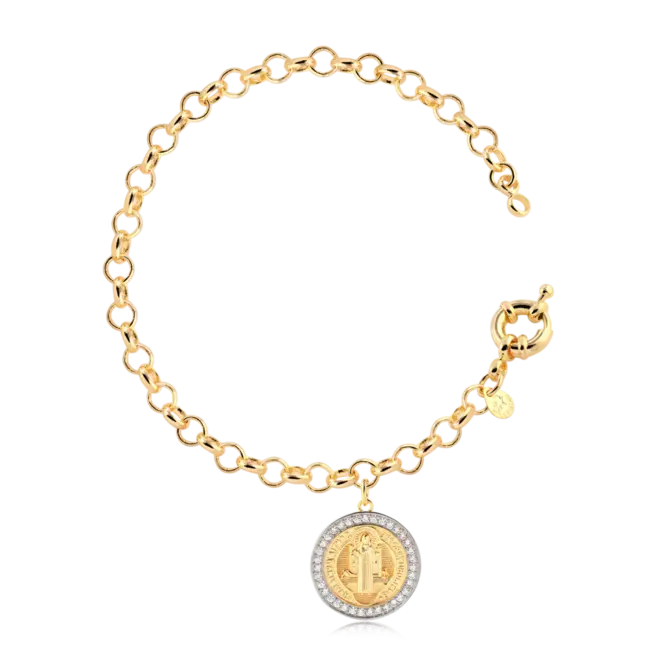 O destaque, no entanto, é o pingente: uma Medalha de São Bento de duas cores, cuidadosamente folheada e cravejada em Zircônias que emolduram o santo, garantindo um brilho intenso que reflete a sua luz interior. Esta pulseira é mais do que um acessório; é um amuleto que oferece amparo e estilo para o seu dia a dia.